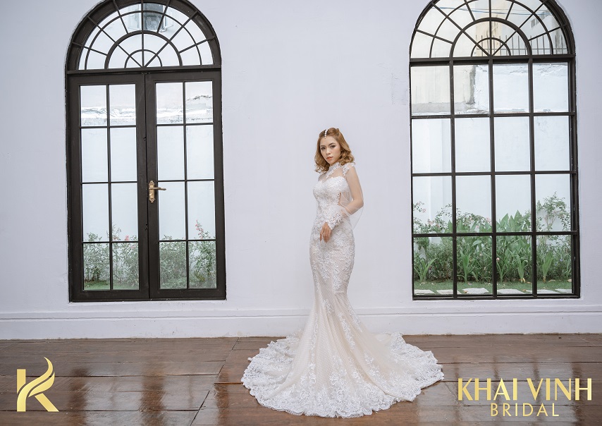 Khải Vinh Bridal thiết kế váy cưới đuôi cá dành cho các cô dâu có thân hình thon thả, khoe đường cong của cơ thể cách gợi cảm, lộng lẫy rất nổi bật ở trong đám đông. Váy cưới đuôi cá được thiết kế ôm sát đường cong cơ thể, khi kết hợp các họa tiết sẽ làm tăng đường nét, tạo điểm nhất sắc nét và chất riêng của mỗi cô dâu.