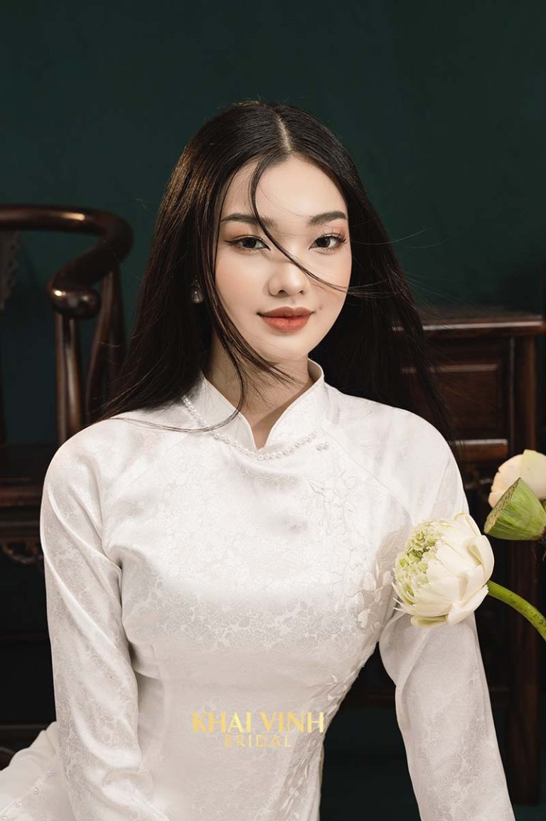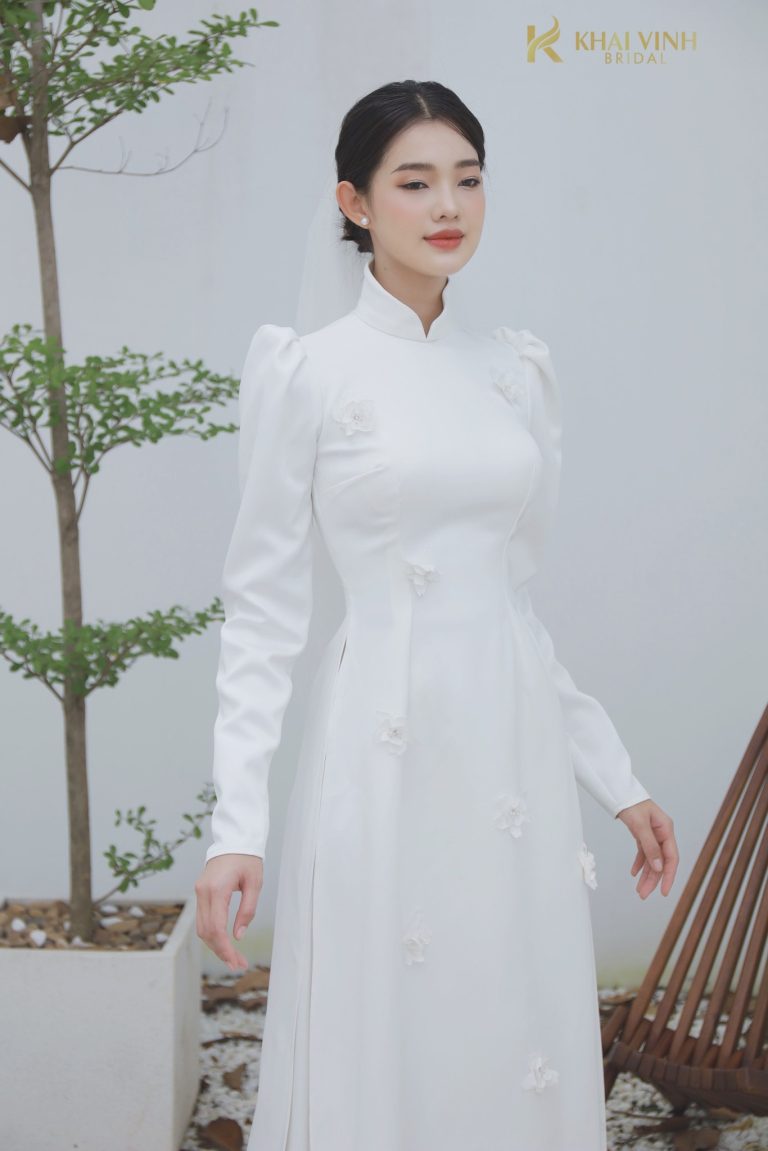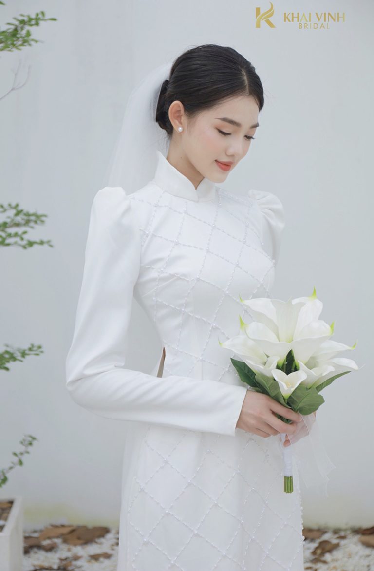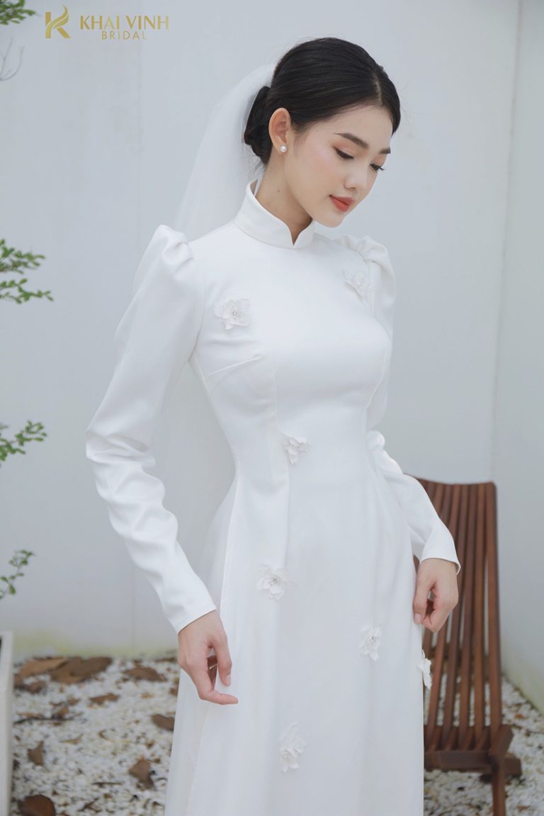 Điểm đặc biệt của mẫu áo dài này nằm ở phần eo. Đội ngũ thiết kế của Khải Vinh Bridal đã đính thêm đá và hoa thành một vòng quanh eo. Thiết kế tạo ra sự mềm mại, uyển chuyển và tôn lên vòng eo cân đối của cô dâu. Mẫu áo này vẫn giữ lại được phần cổ trụ truyền thống. Phần tay áo ôm sát khoe trọn bờ vai ngọc ngà, thanh mảnh của cô dâu. Đi kèm với áo dài là chiếc mũ mấn màu trắng. Mũ được đính kết tinh xảo tạo nên thiết kế tổng thể nổi bật, thanh tú và duyên dáng.