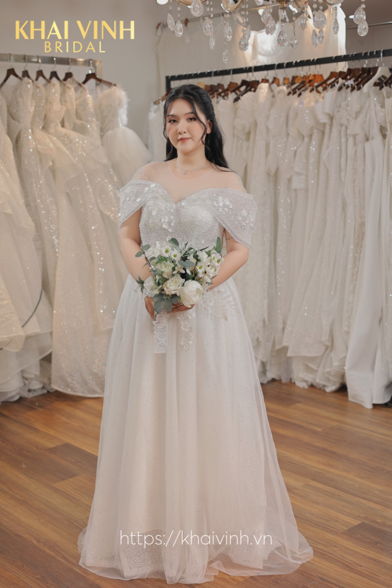 Váy cưới chữ A Big size trễ vai thêu hoa nhí kiêu kỳ