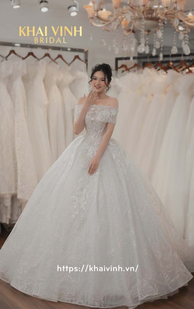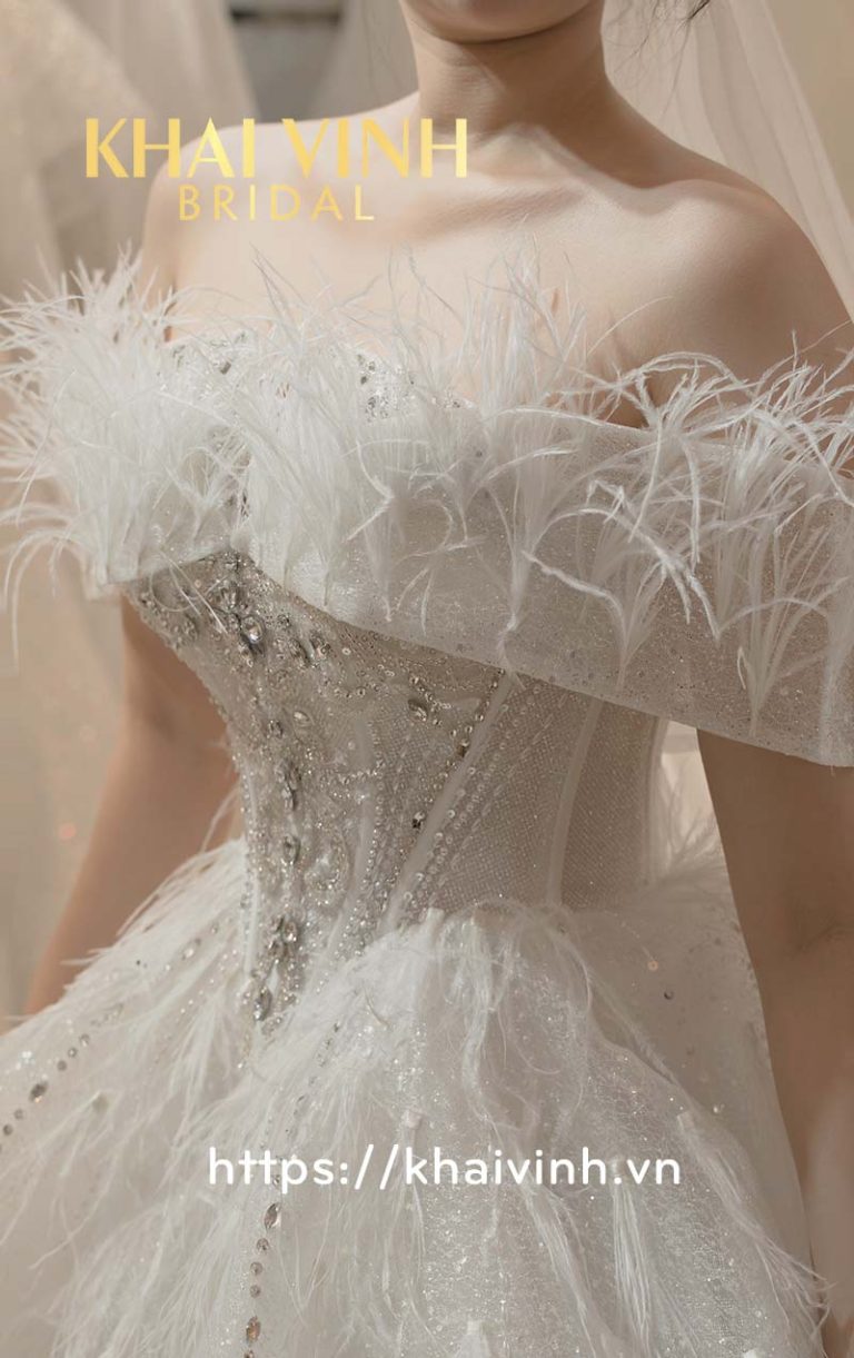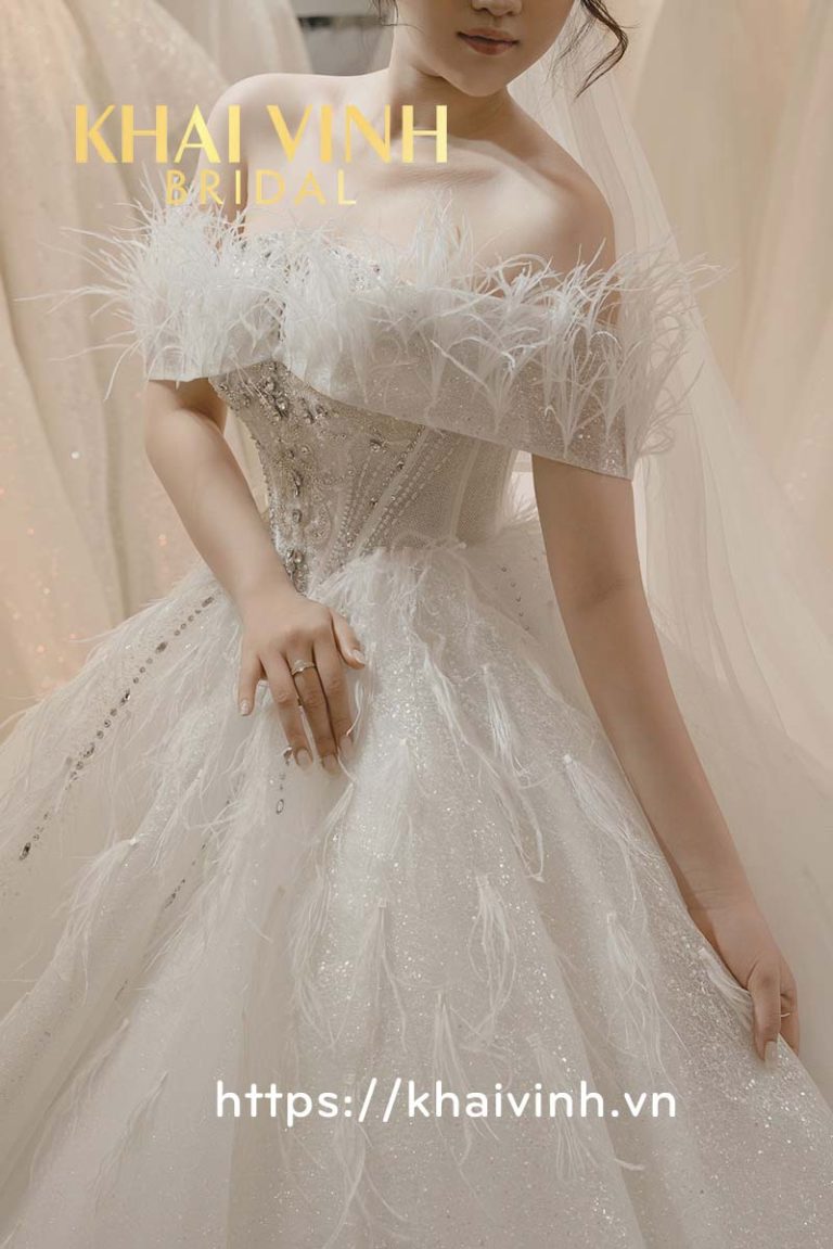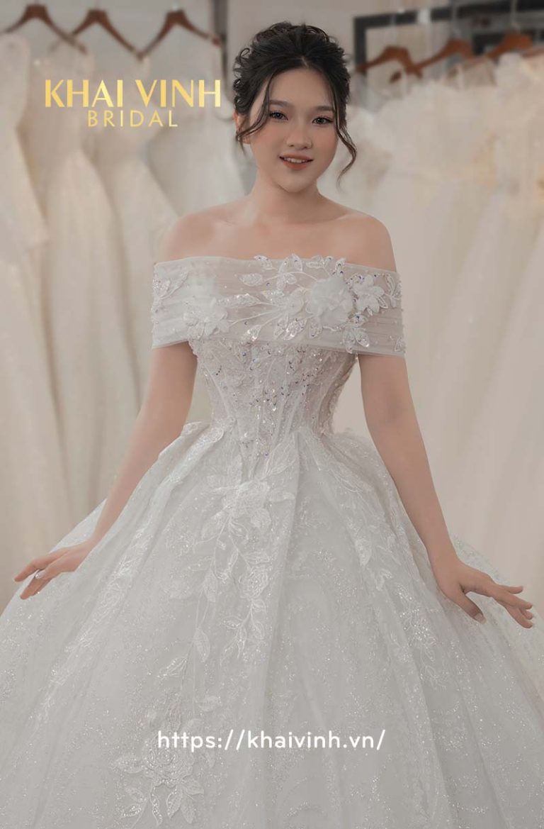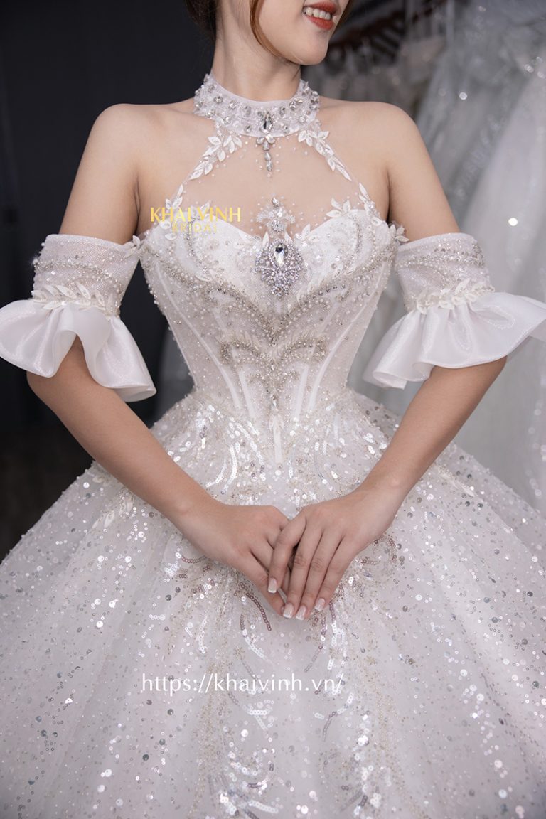 Váy cưới công chúa đính đá pha lê, tay lỡ, cổ yếm