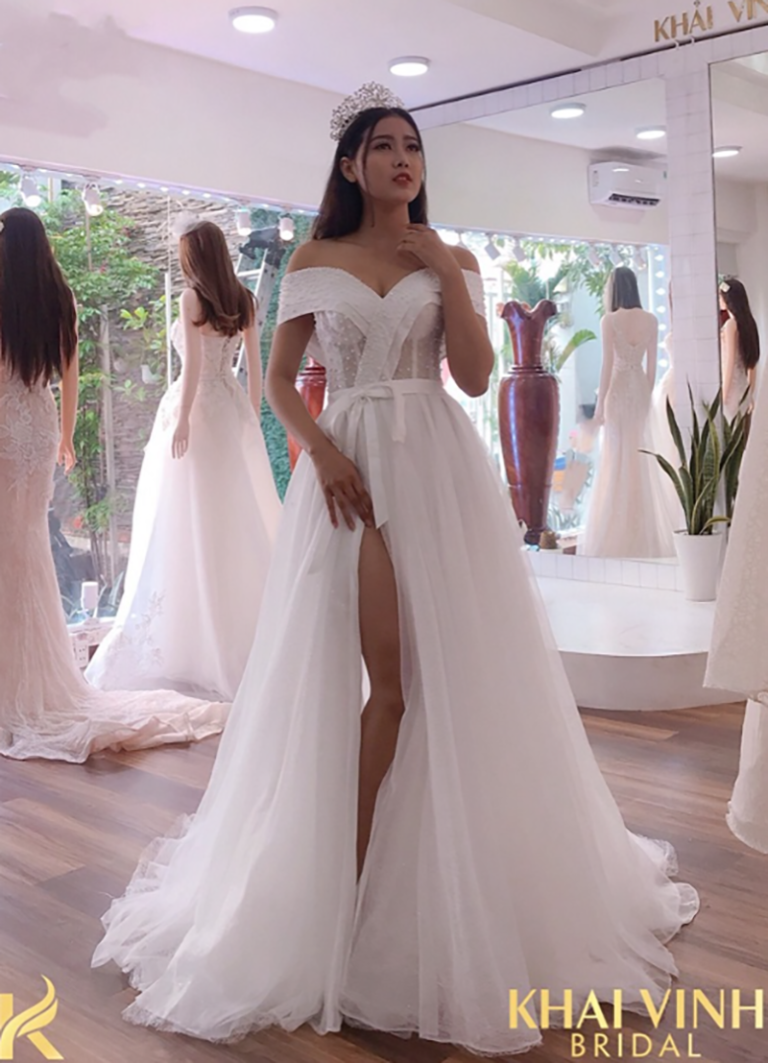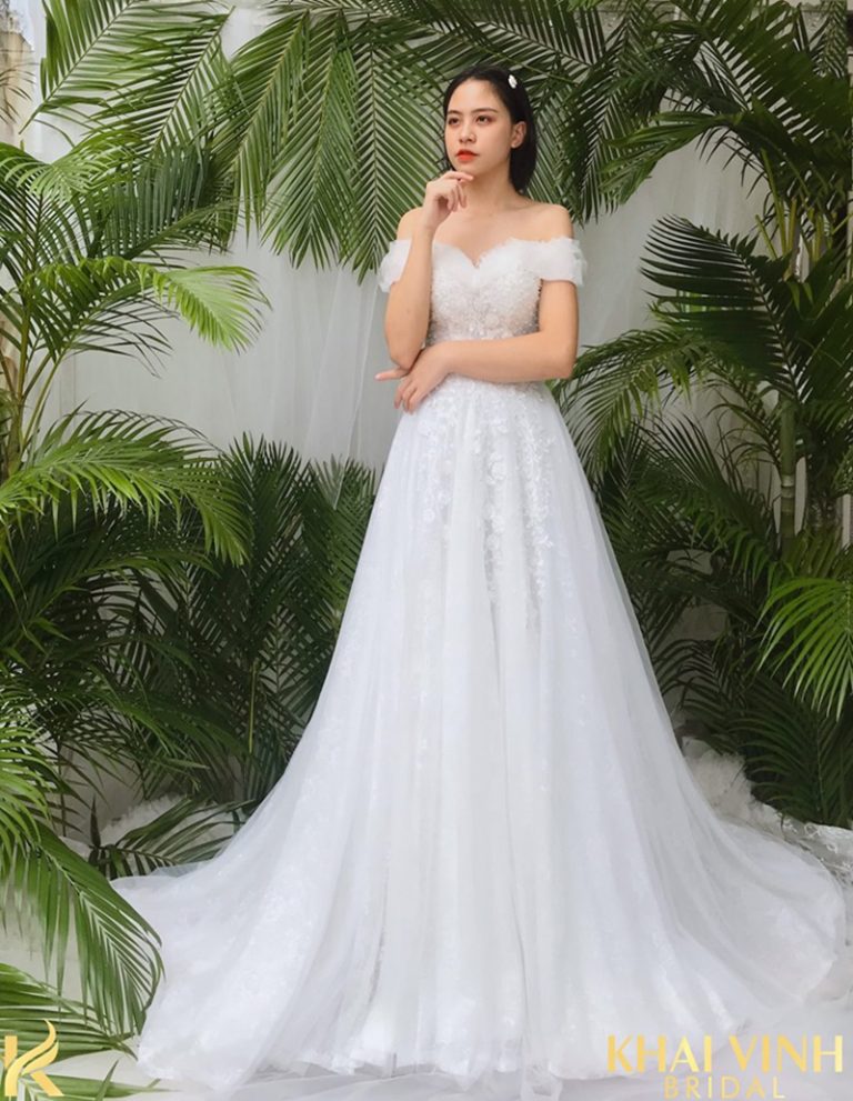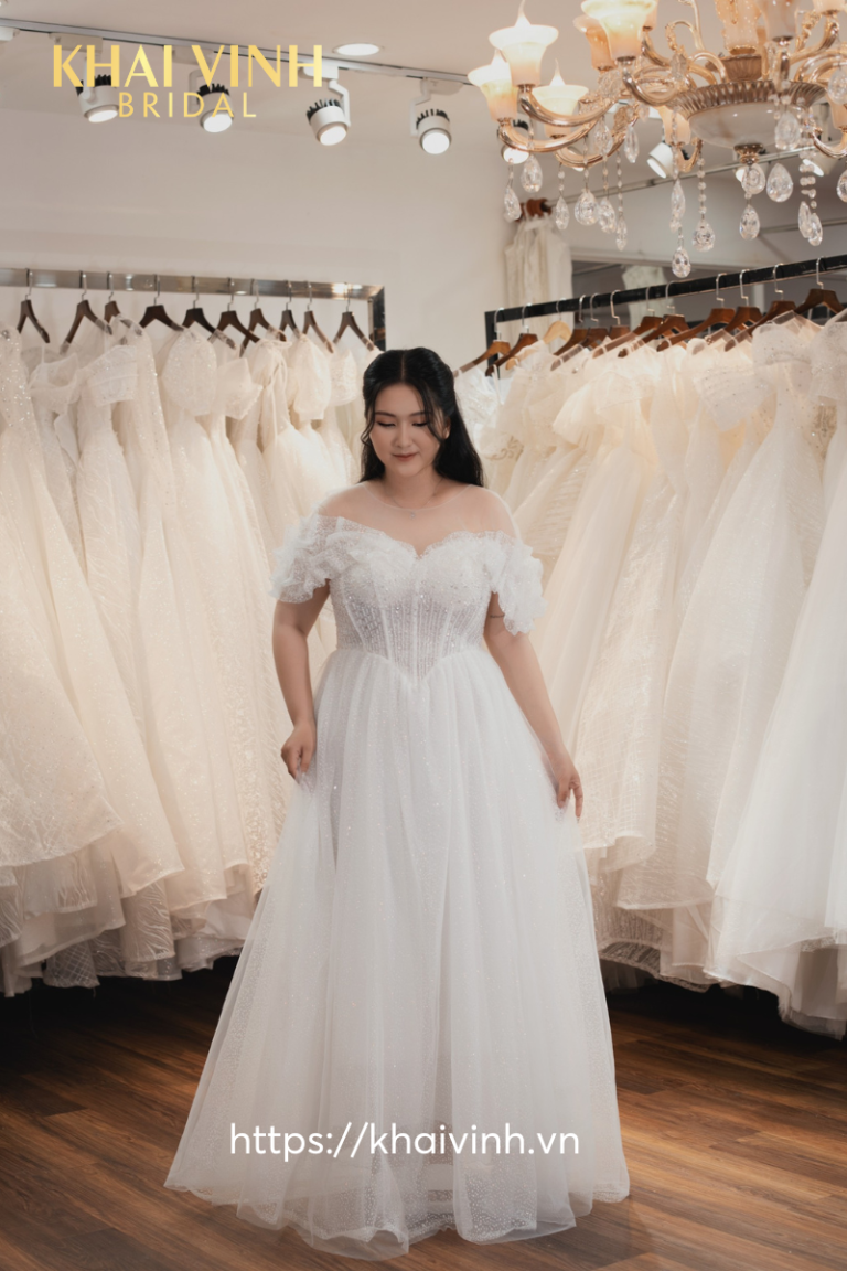 Váy cưới đi bàn Big size trễ vai tay nhún bèo xinh