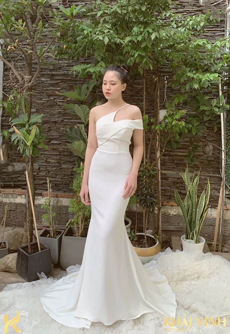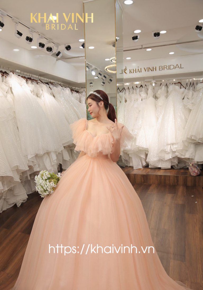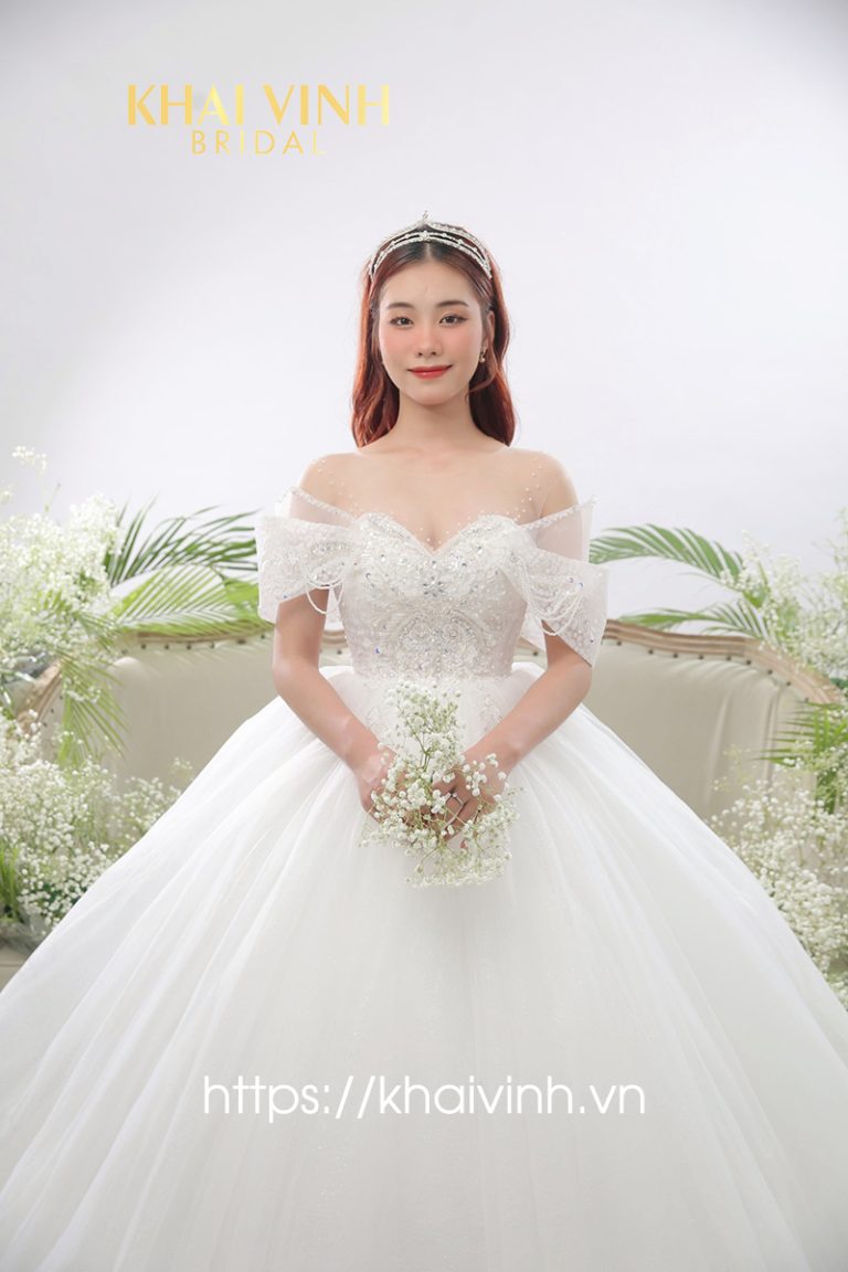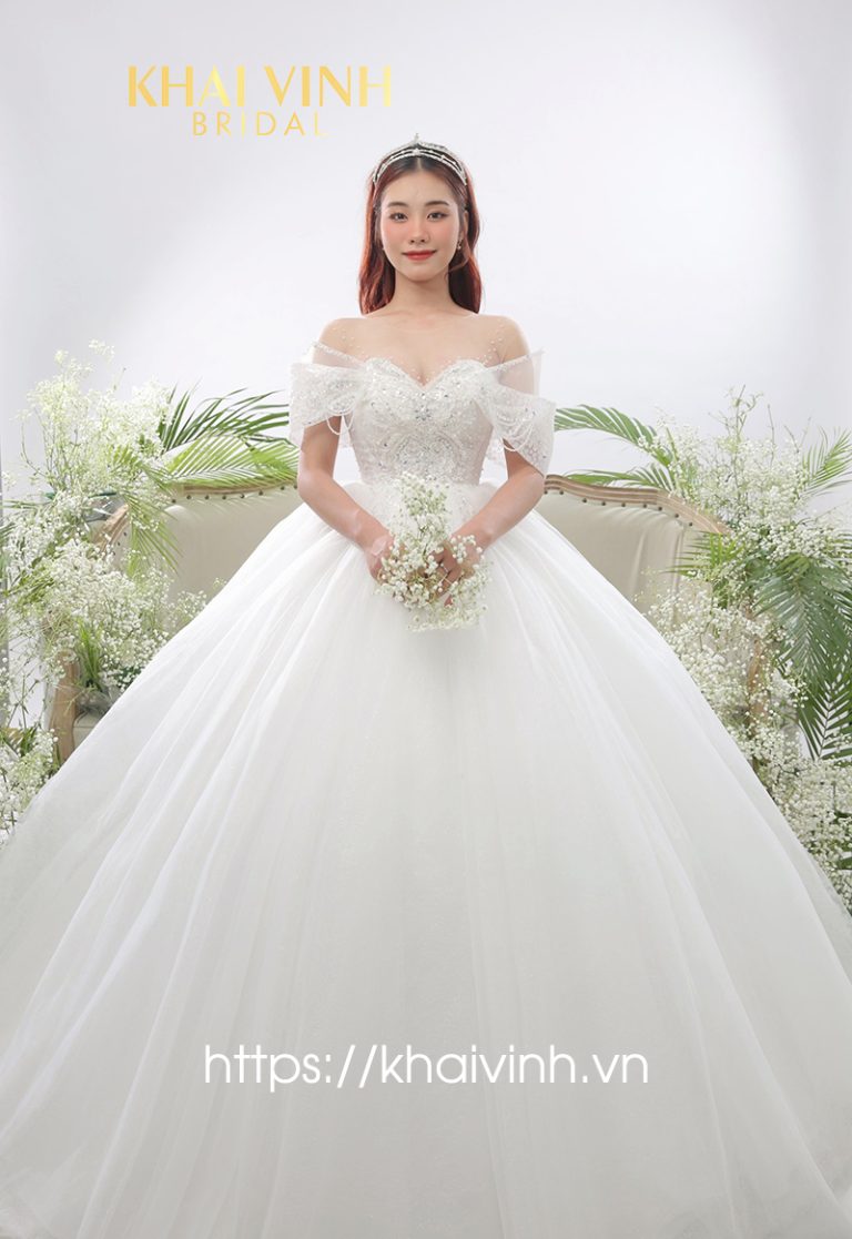 Áo cưới trễ vai xòe phồng – Màu xám nhẹ