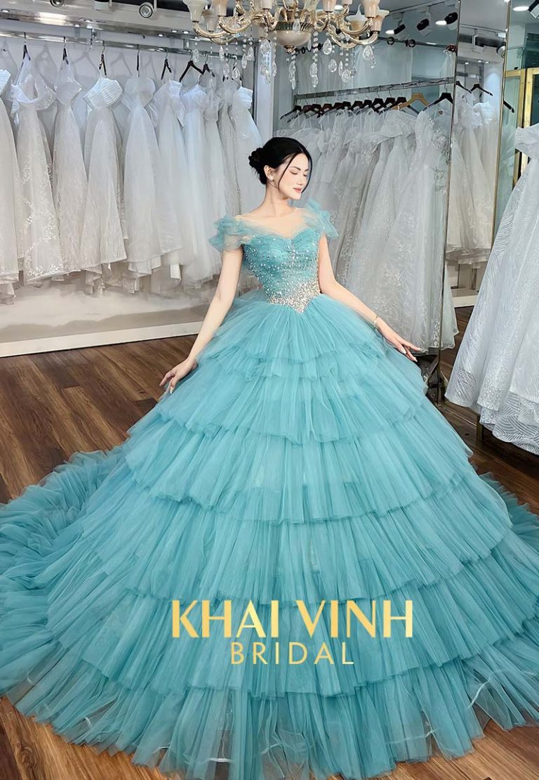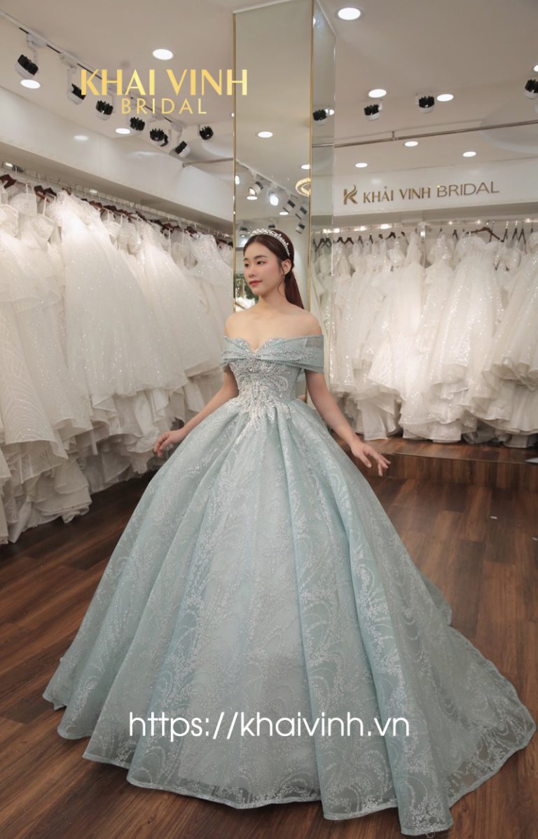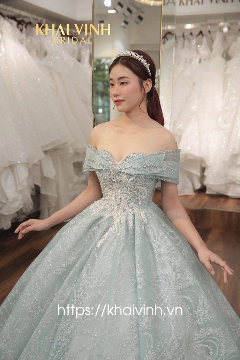 Áo cưới xòe giả vai trần chấm bông bi màu xanh ngọc
