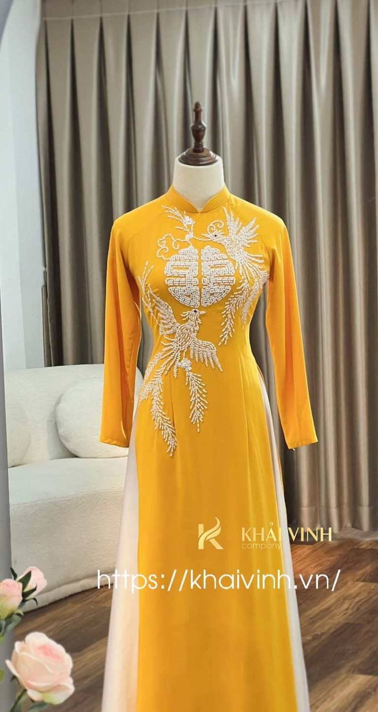 Áo dài cô dâu màu vàng đính kết cặp chim hạc