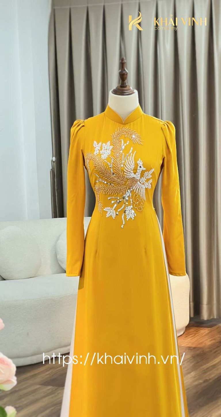 Áo dài cưới màu vàng kết chim công bằng kim sa, cườm thủ công