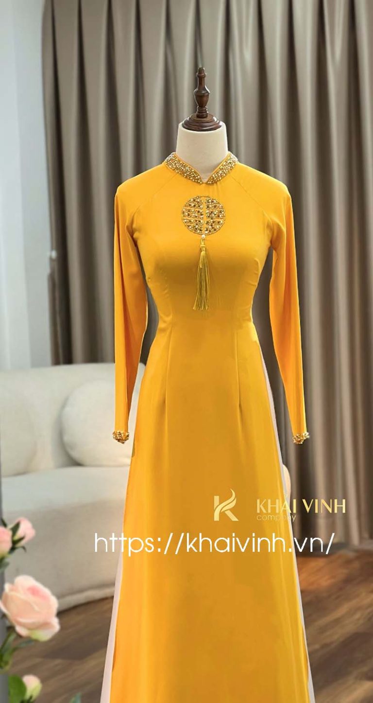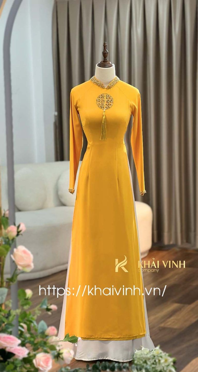 Áo dài cô dâu ăn hỏi màu vàng – Thêu đồng tiền trước ngực