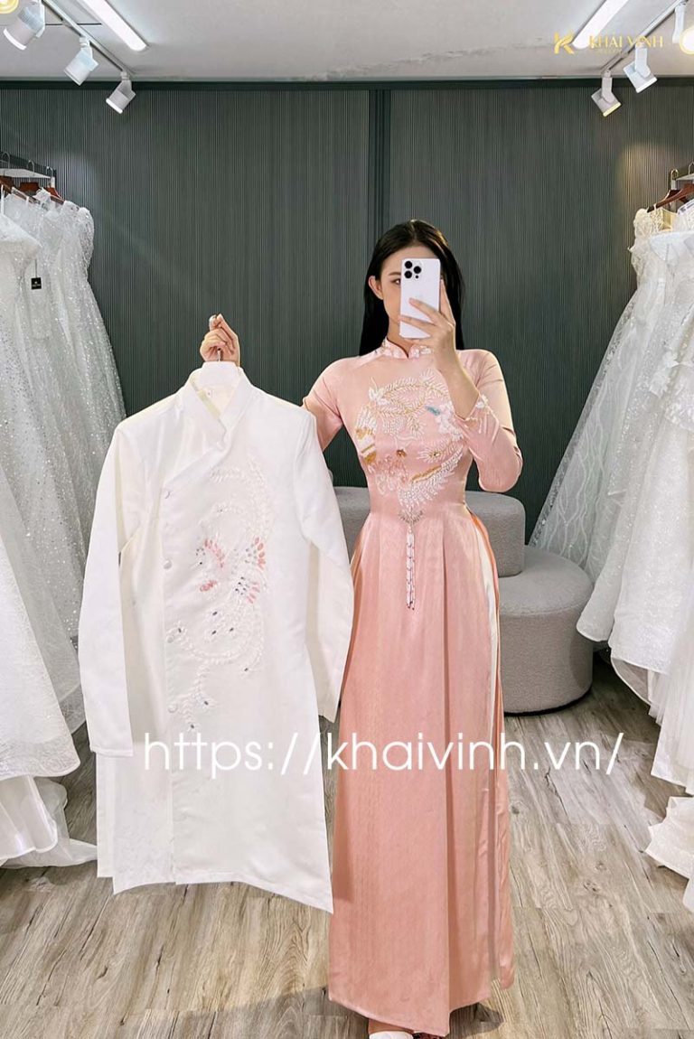 Áo dài cưới cặp xanh cổ vịt/ hồng pastel