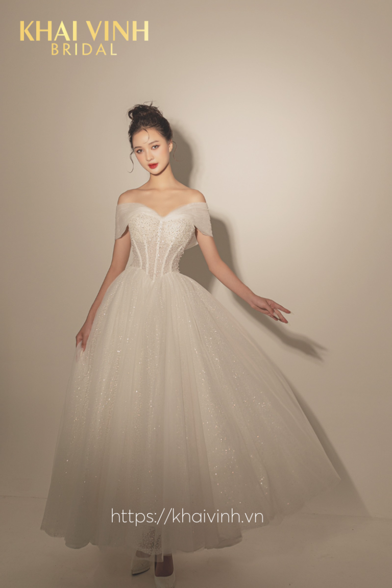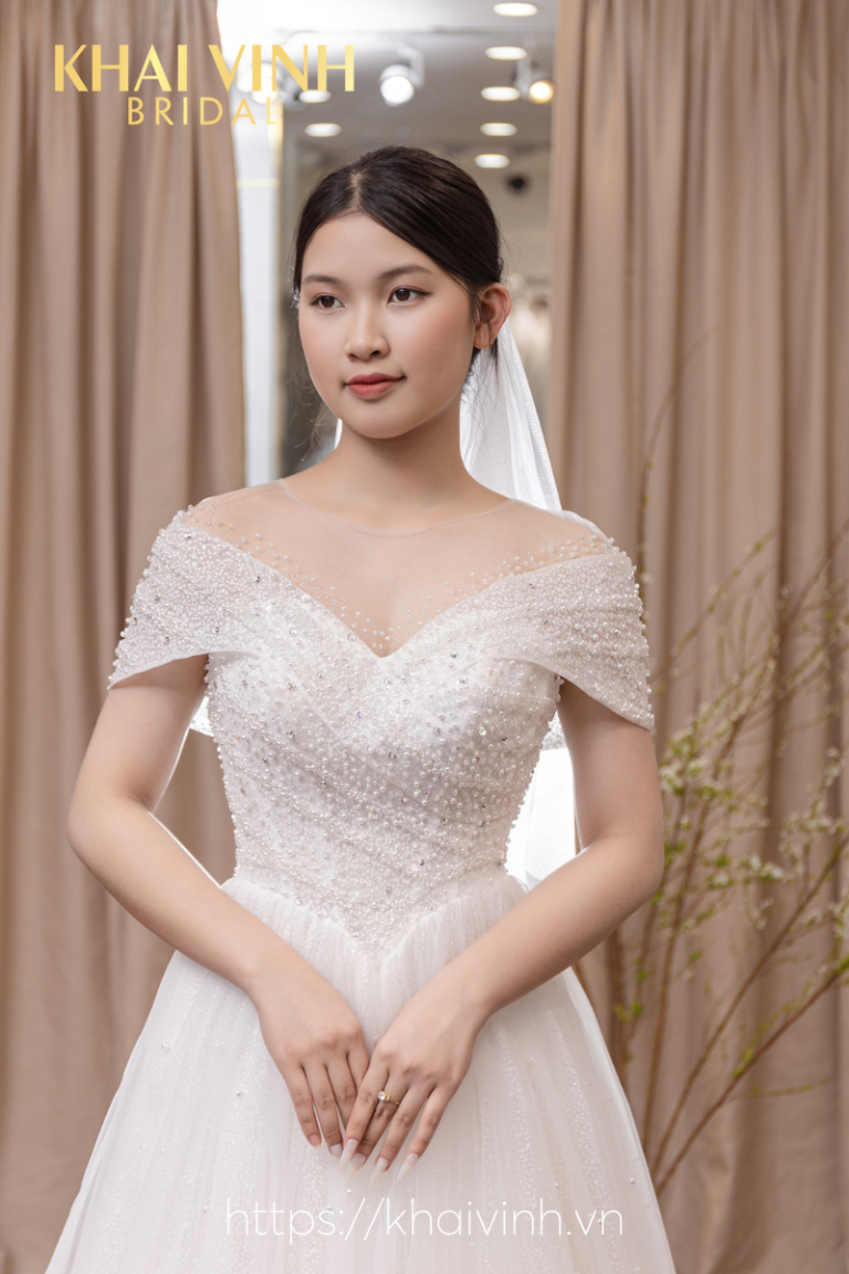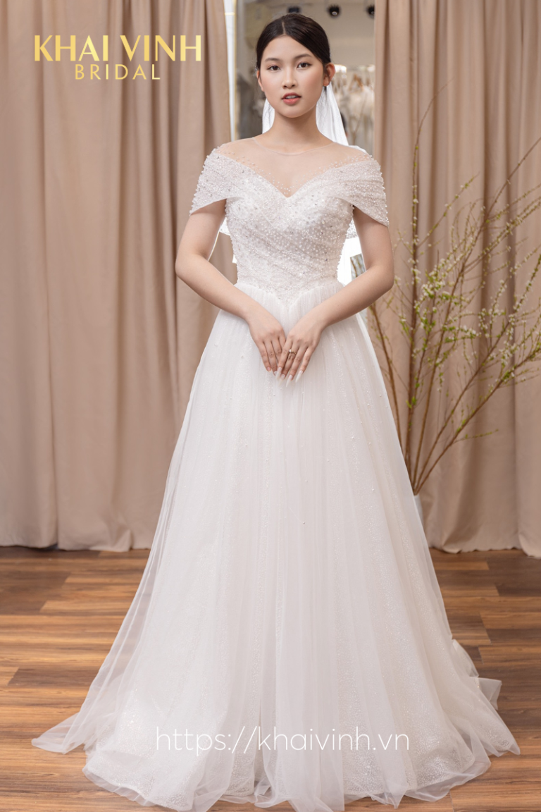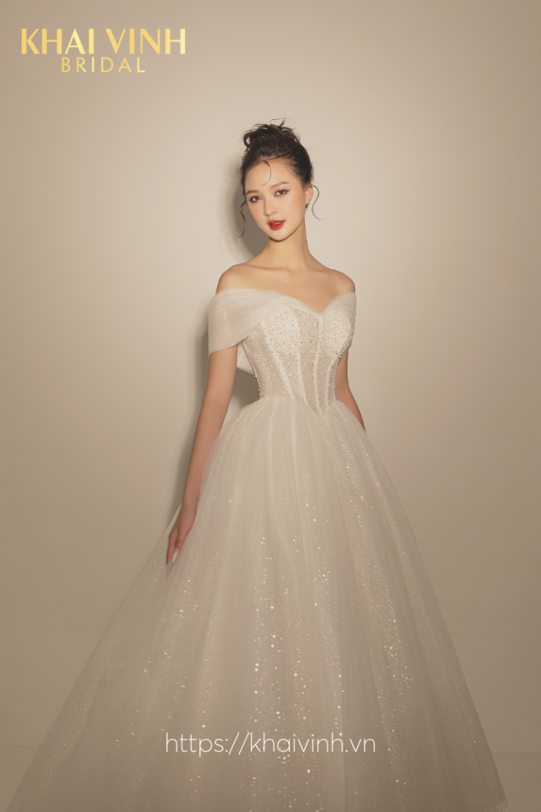 Váy cưới chữ A trễ vai đính hạt
