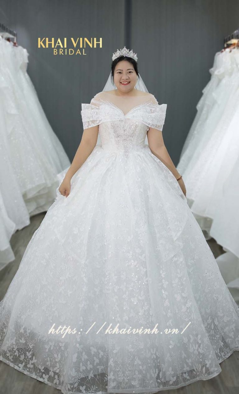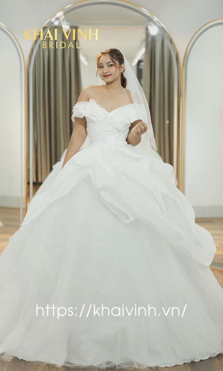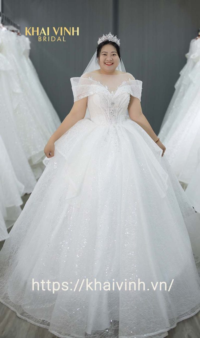Váy cưới cô dâu mập kiểu công chúa trễ vai