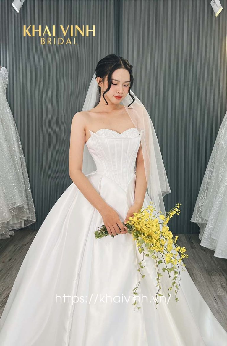 Váy cưới ngắn đi tiệc đính đá từ ngực xuống eo