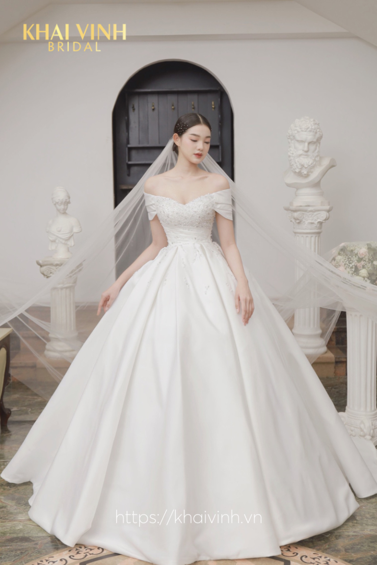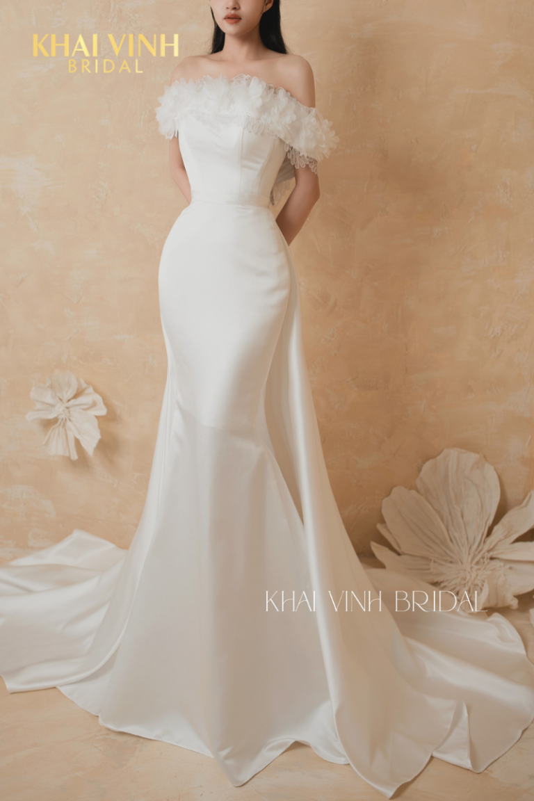 Váy cưới đuôi cá Satin Hàn Quốc trễ vai kinh điển