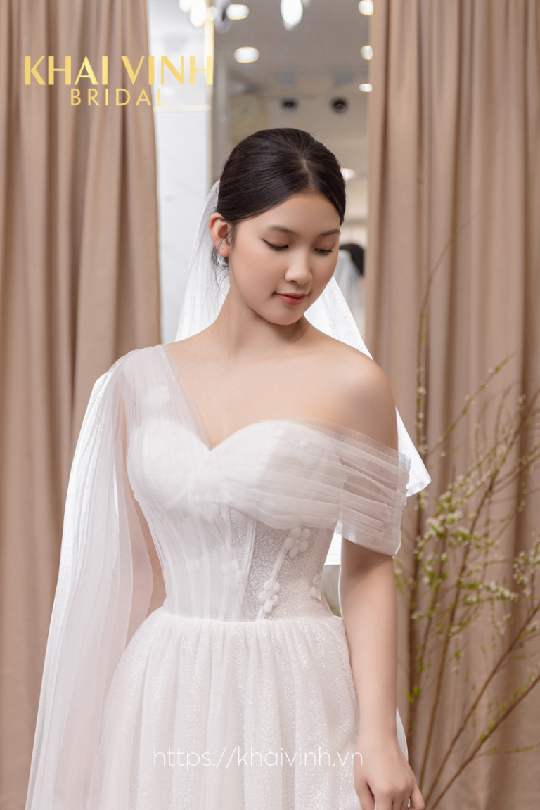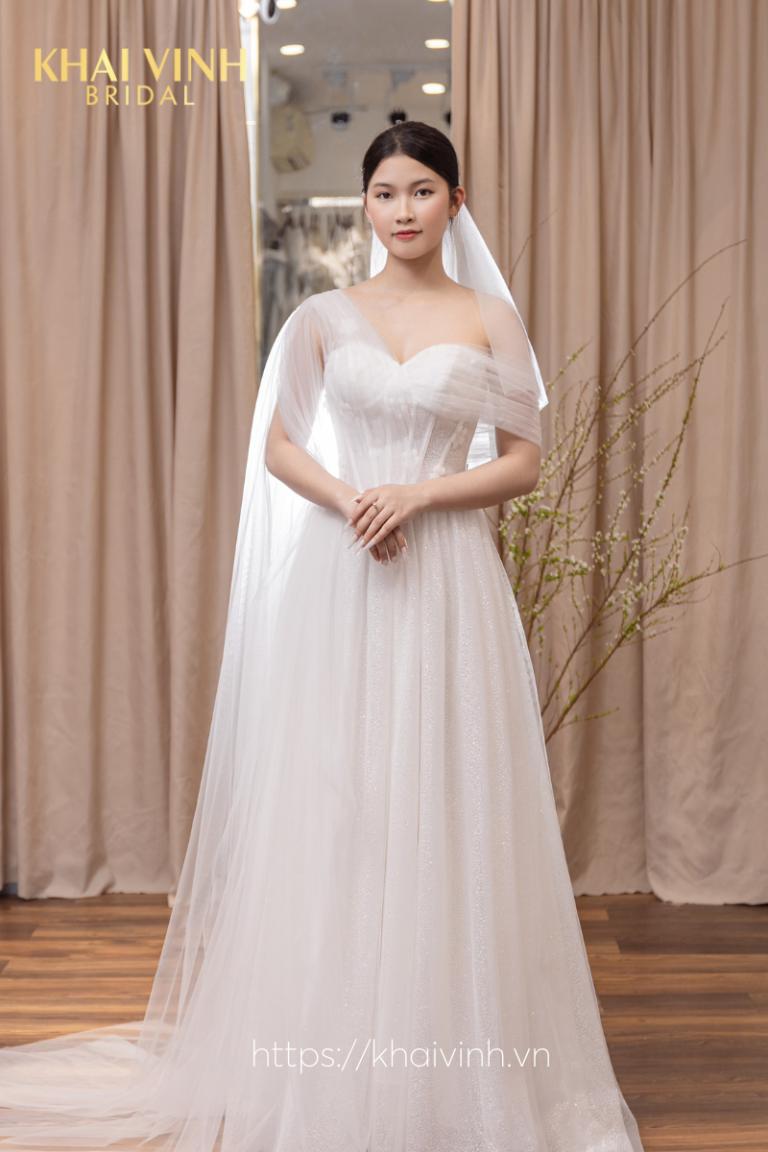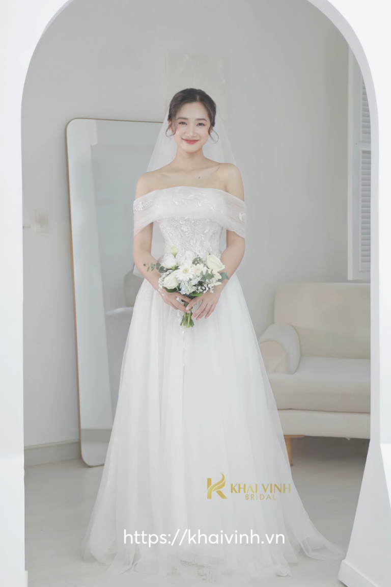 Váy cưới suông A trễ vai ngang Hàn Quốc