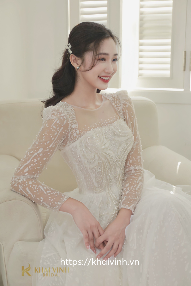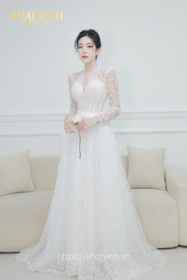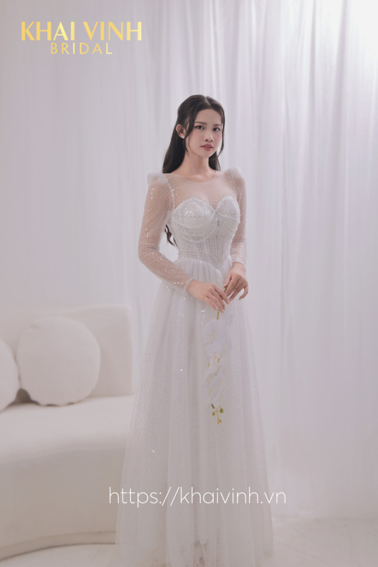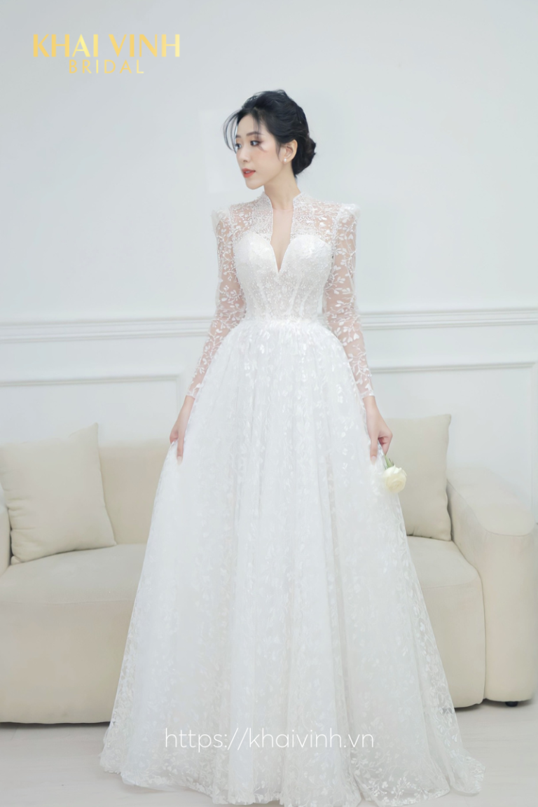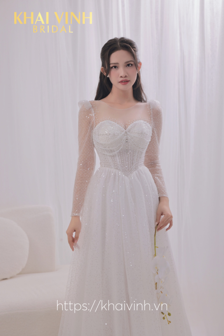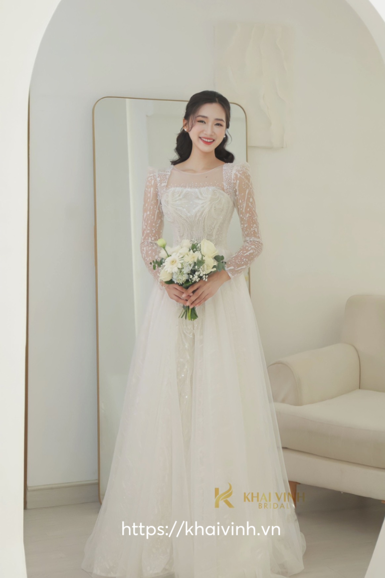 Váy cưới chữ A tay dài kim sa dệt cao cấp