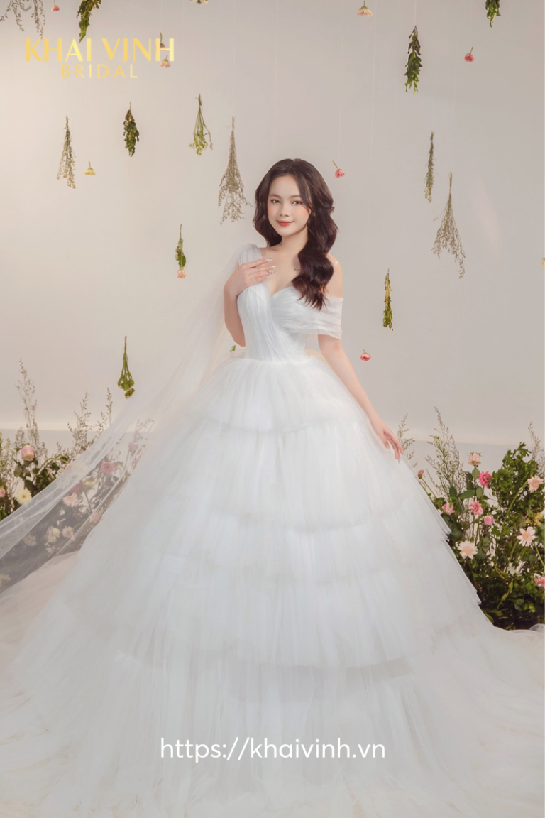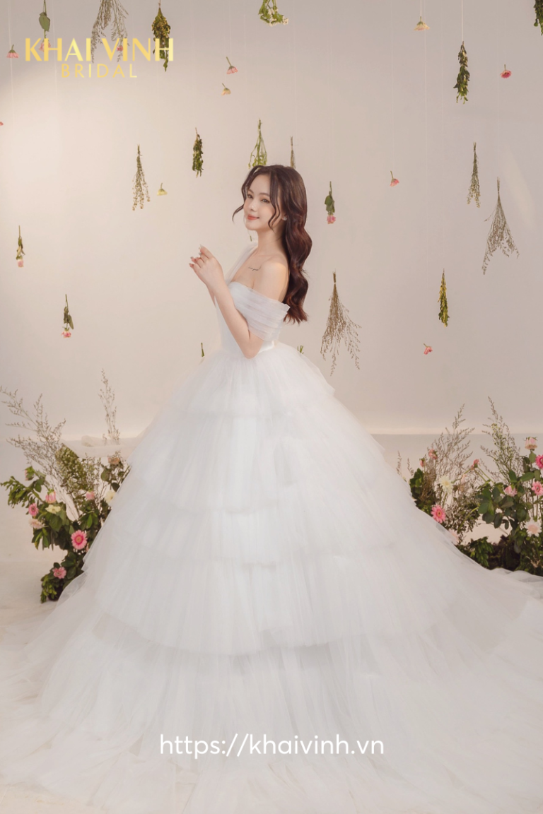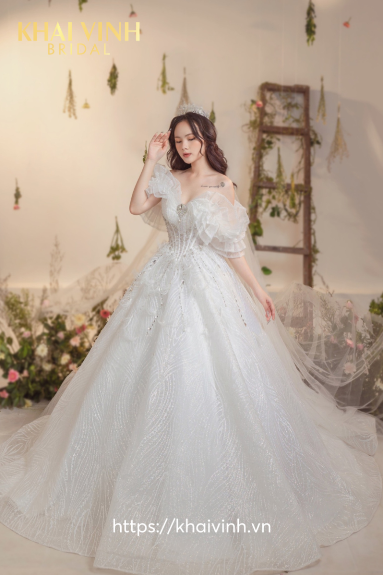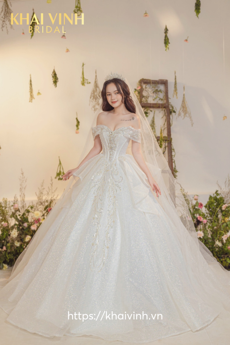Váy cưới công chúa thiết kế riêng trễ vai hoàng gia